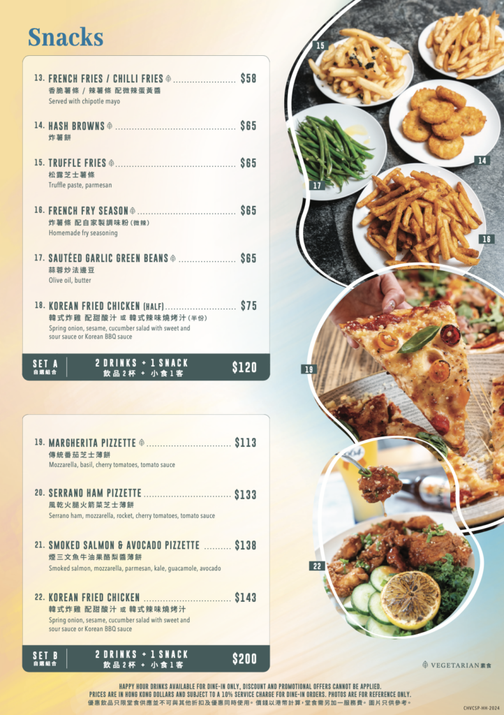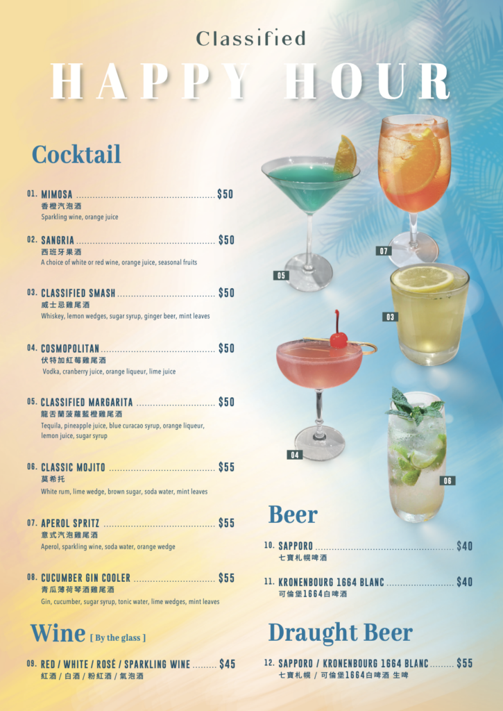 Enjoy Classified’s new and mouthwatering Happy Hour menu with amazing discounted price of cocktail, beer and house wine, together with various selection of snacks and combo set such as bites, pizza, platters and fried chicken. Grab your friend and come, don’t miss out!